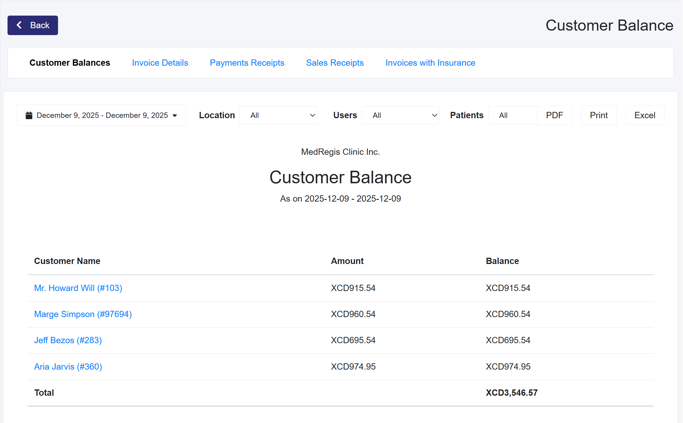 Users can generate various accounting reports for invoices and receipts related to patient appointments or other patient billing.