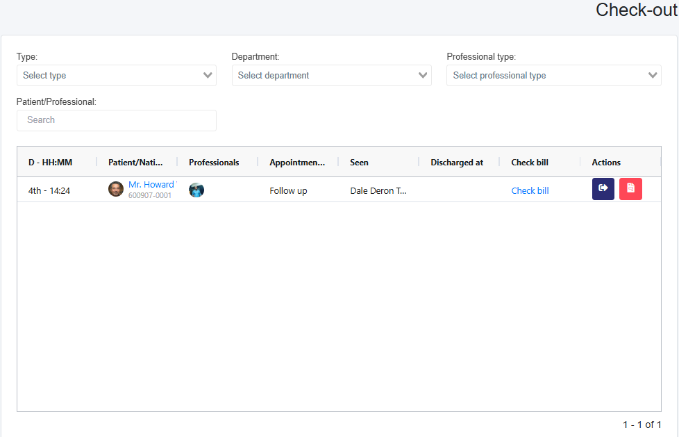 - Go to the Checkout section and select the patient who needs to Checkout.