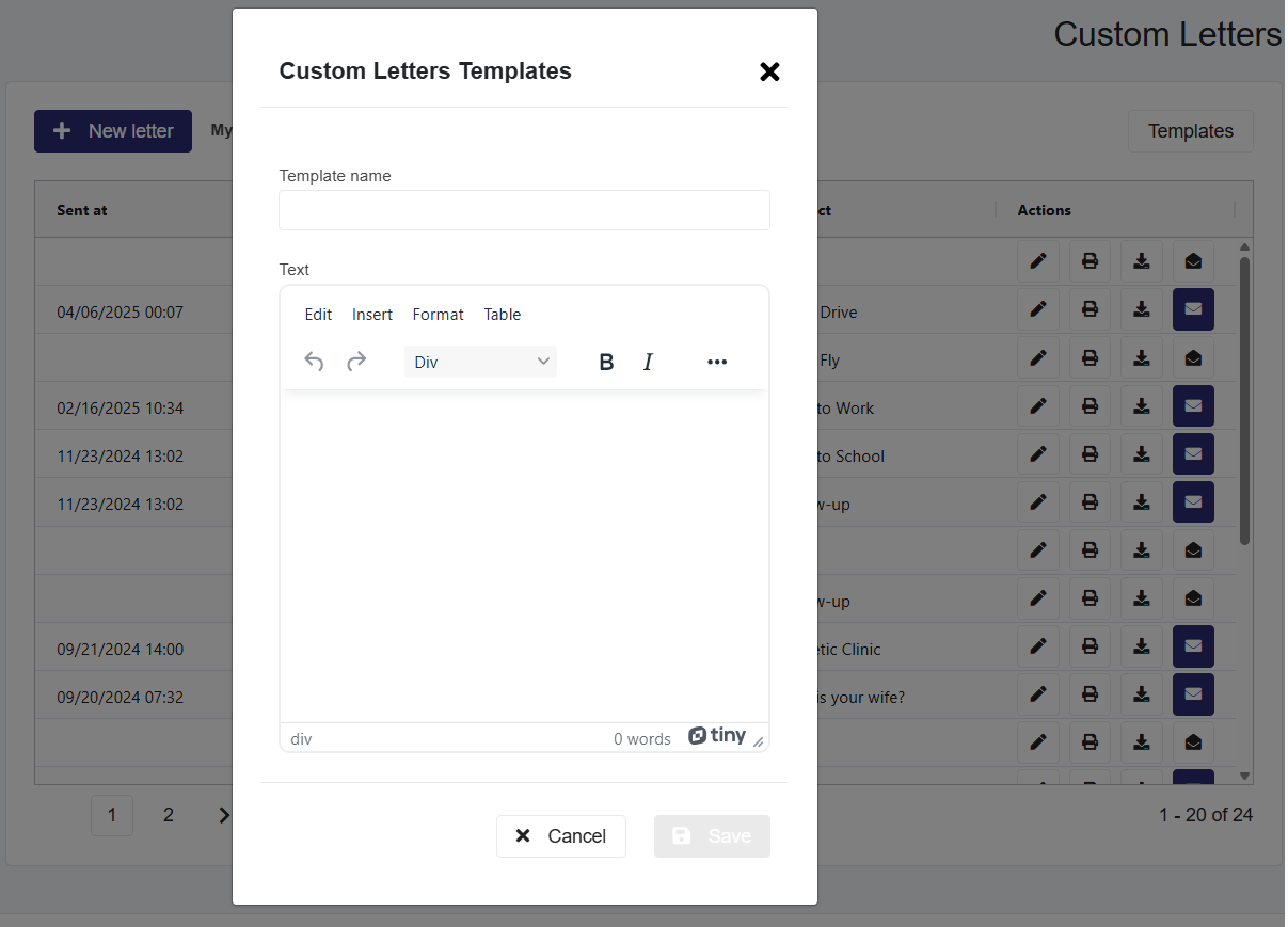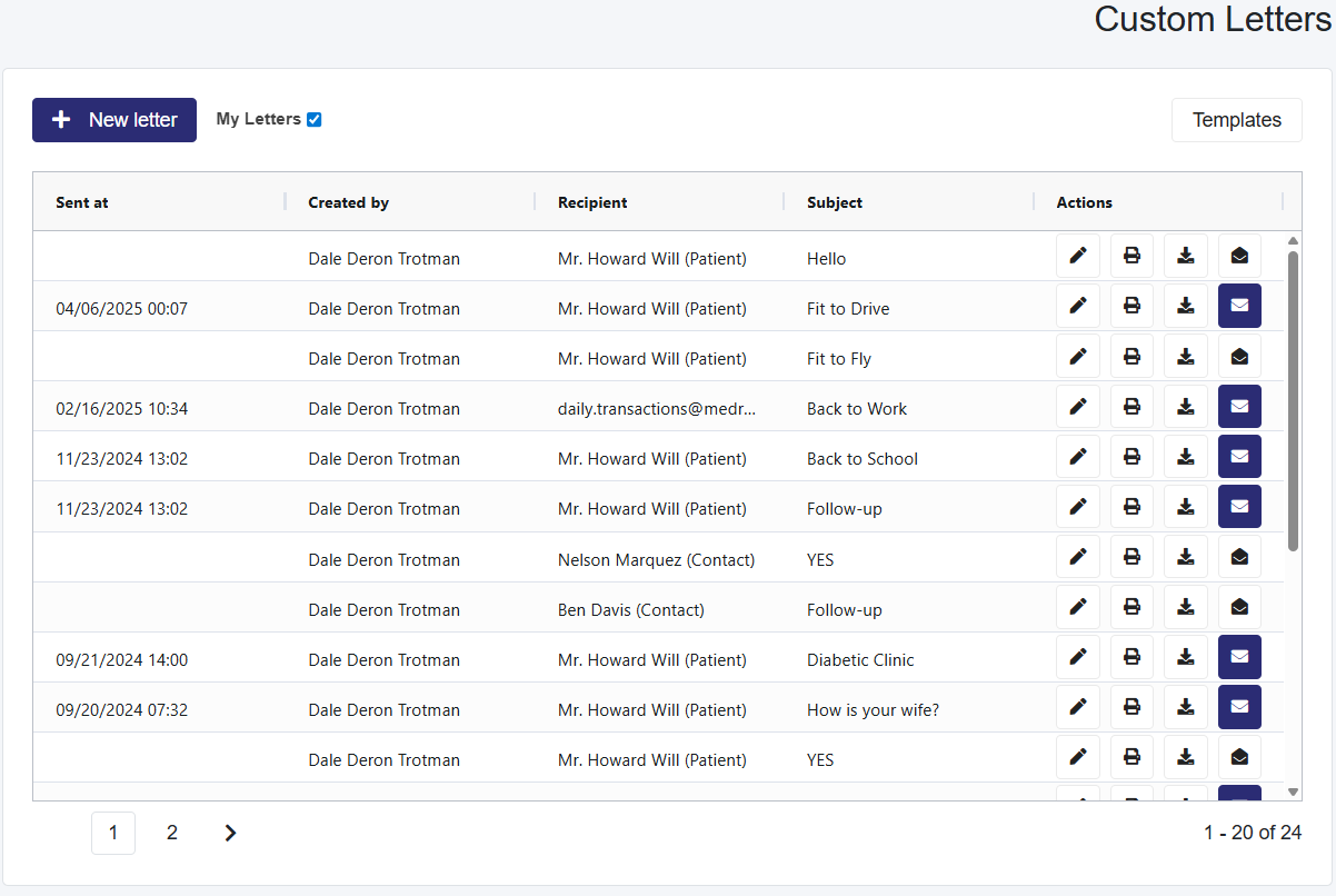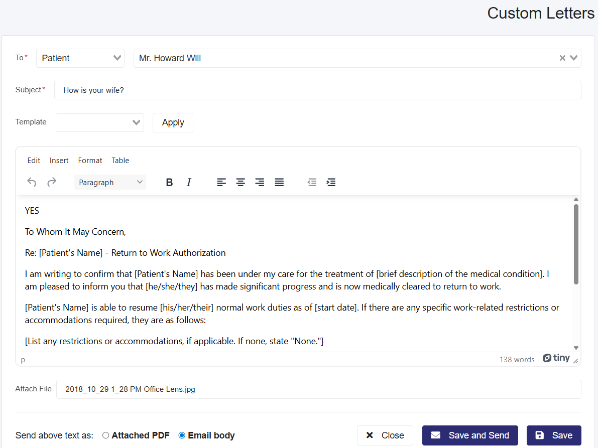 For Custom Letters: Send Text As: Email Body (the message is seen in the email body by the receiver); include your contact information in the email body. For faster documentation, add it to every template, or save a contact template to use when you need to add contact information in your message.