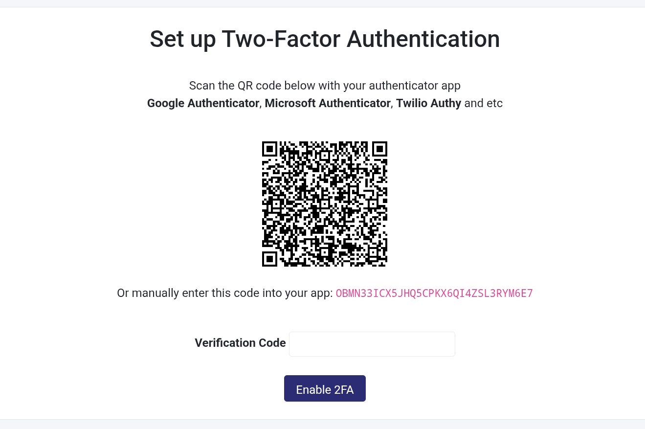 - Select the Enable 2FA button and 2FA is now active.